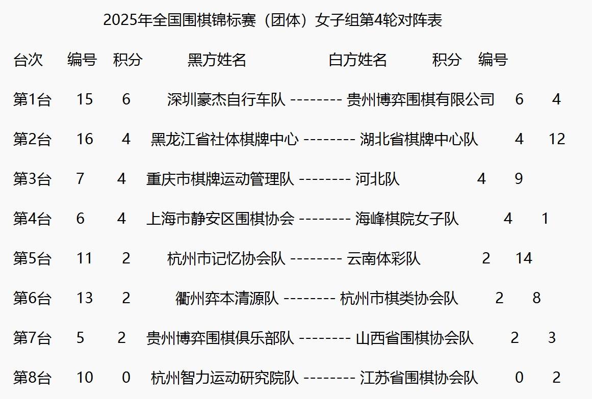 明天进行第四轮比赛,男子围乙,积6分的上海队下调对积5分的山西省围棋协会队;女子围乙,同积6分的深圳豪杰自行车队、贵州博弈围棋有限公司队展开对冲。围丙同积6分的北京市围棋协会队与重庆市九龙坡区队将展开对冲。