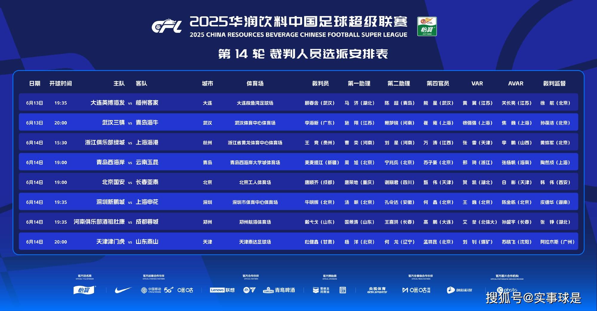 6月13日、14日,2025赛季中超联赛展开第14轮角逐。赛前,中国足协发布了本轮裁判人员选派安排表。