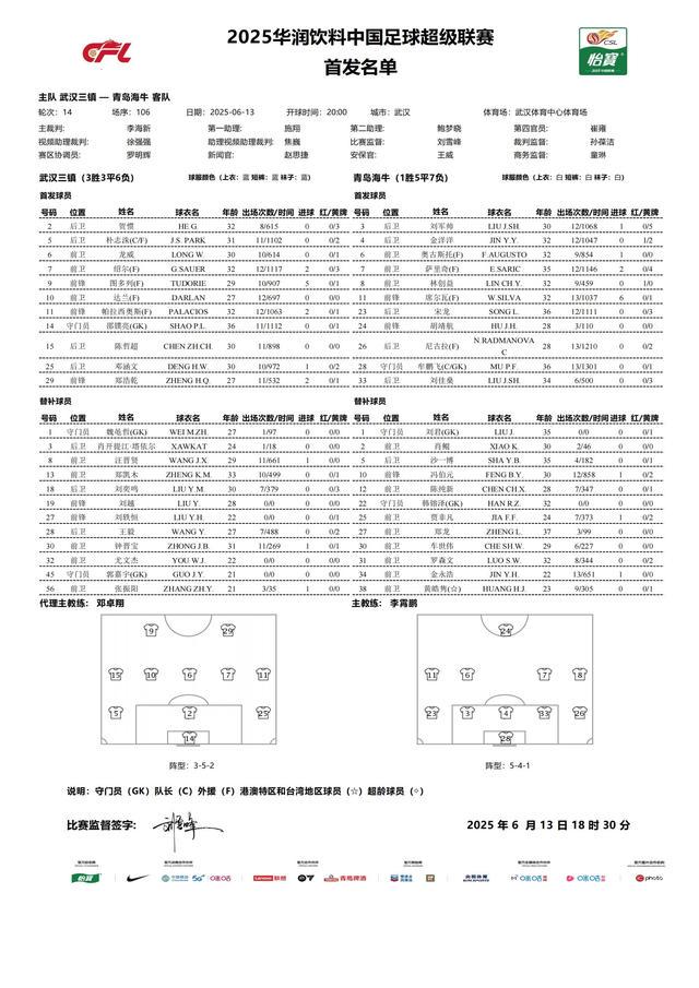 北京时间6月13日19点35分,中超第14轮武汉三镇坐镇主场对阵倒数第二名的青岛海牛,赛前公布首发名单。
