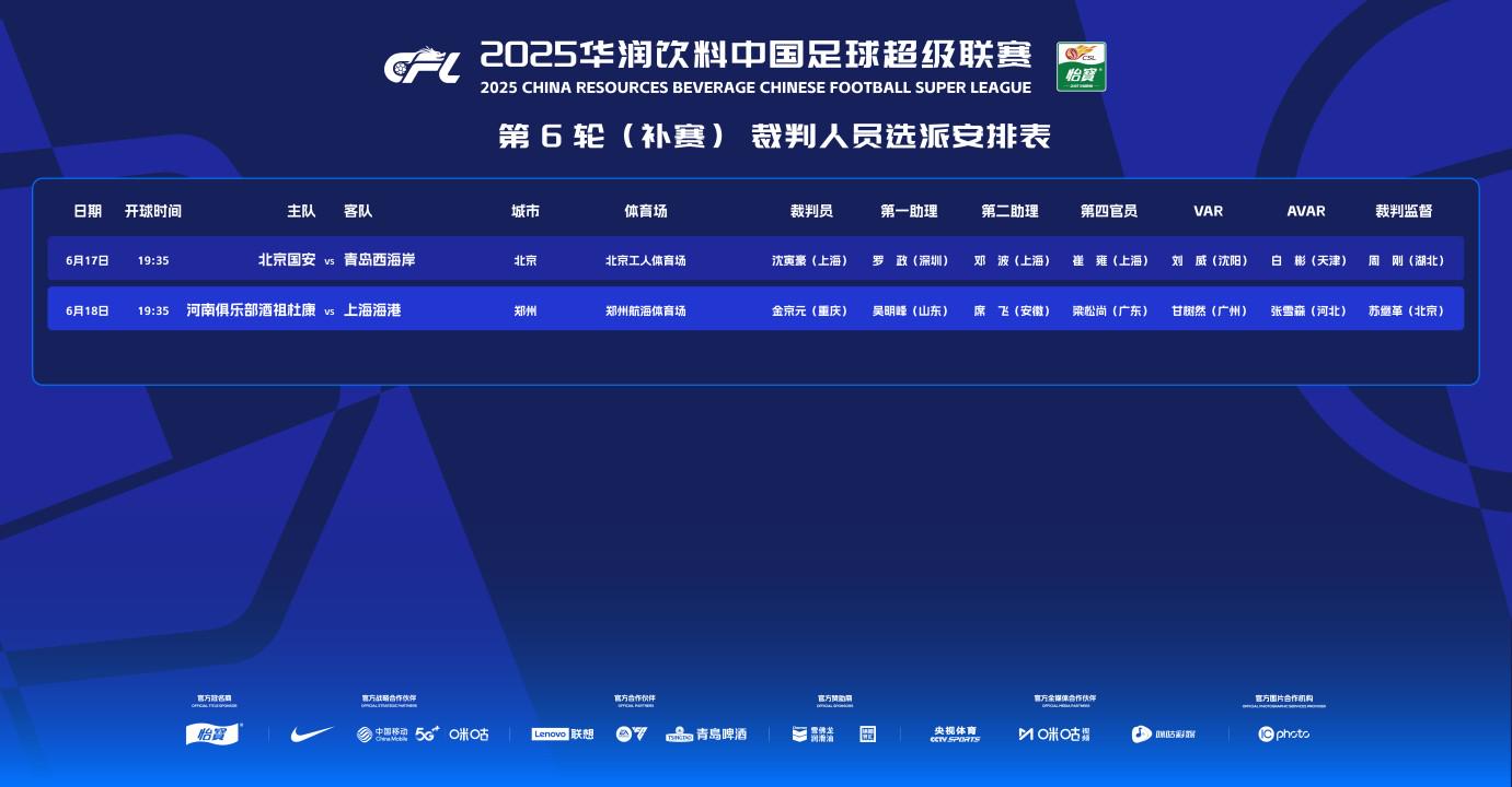 北京时间6月17日,中超官方公布了中超第六轮补赛裁判选派表,其中沈寅豪执法国安vs西海岸,金京元吹河南vs海港。