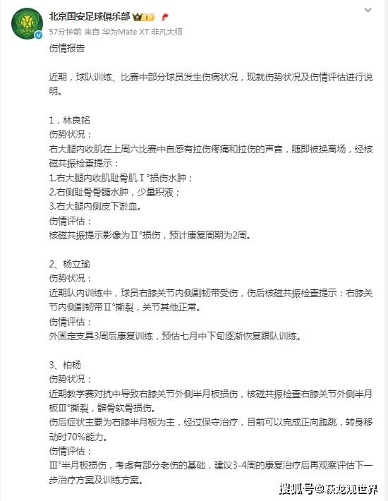 国安三虎伤缺!英博有机会。6月20日,国安俱乐部官方发布球员伤情报告,林良铭右大腿拉伤预计缺席2周;杨立瑜右膝关节内侧副韧带撕裂,预计7月中下旬恢复;柏杨半月板损伤,3-4周后评估。三虎伤缺,攻防两端会受到影响。有国安球迷自我安慰:“林皇踢申花能上,我就放心了!”