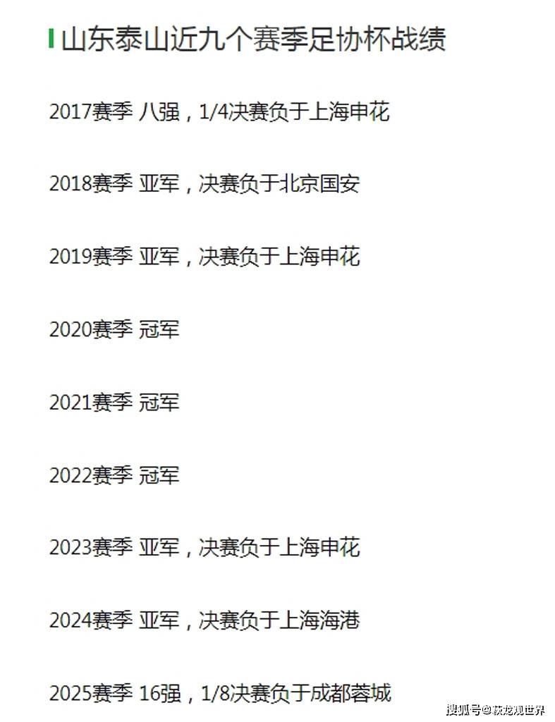 泰山近九个赛季足协杯战绩: