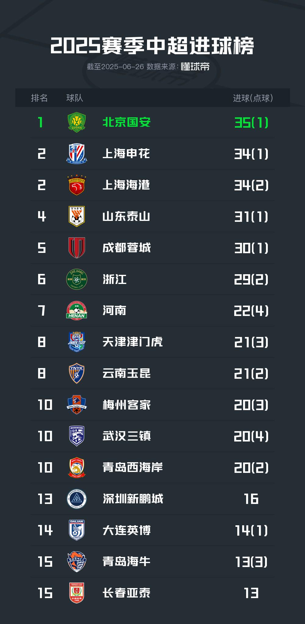 北京时间6月26日,2025赛季中超半程的比赛全部结束,球队进球榜方面半程冠军北京国安35球居首,而处于降级区的青岛海牛、长春亚泰以13球并列垫底。