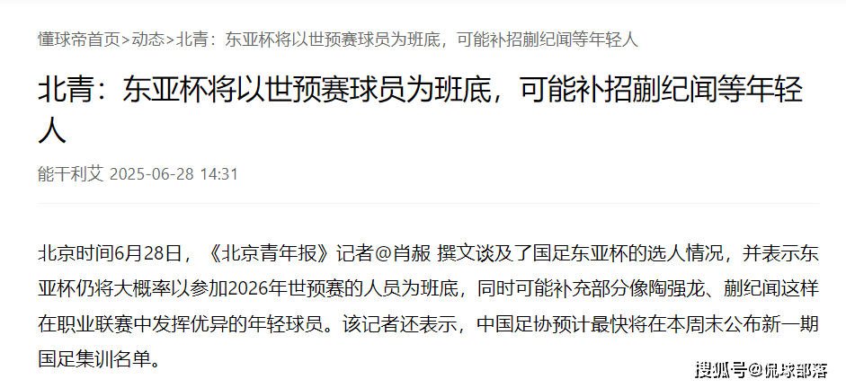 其中《北京青年报》也在报道中确认东亚杯仍将大概率以参加2026年世预赛的人员为班底,同时可能补充部分像陶强龙、蒯纪闻这样在职业联赛中发挥优异的年轻球员。